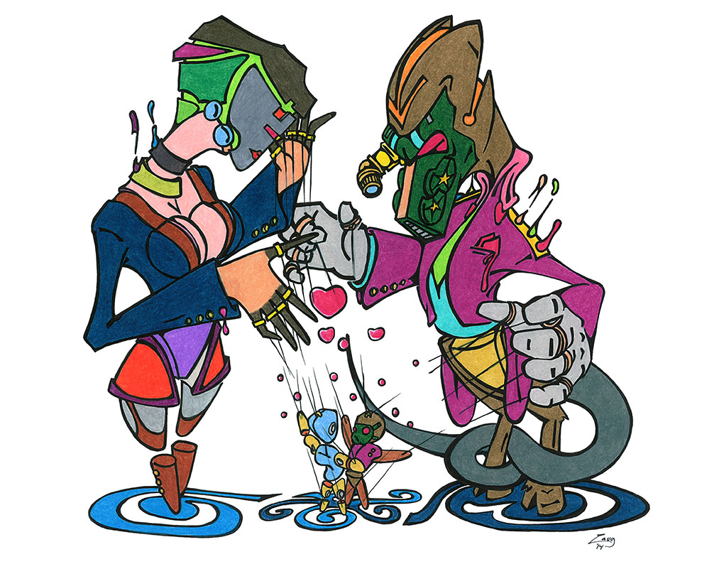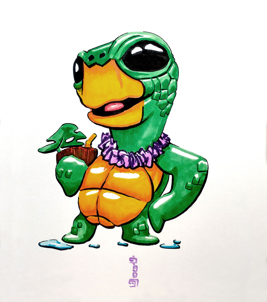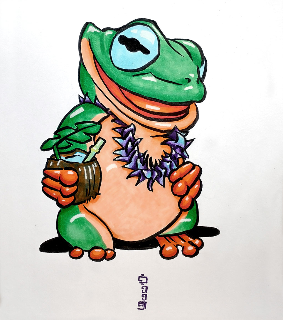 Revo’s art carries the sharpest edge of Wiiowii. Using varied line weights and bold three-color step fills, each piece feels like a secret etched into shadow and light. Unlike any other style on the island, Revo captures all the characters of Wiiowii, binding them together through imagery laced with forbidden codes. Every symbol invites interpretation, every contrast suggests what lies hidden in the shadows of Zaug.