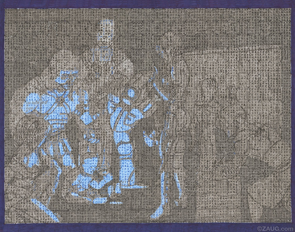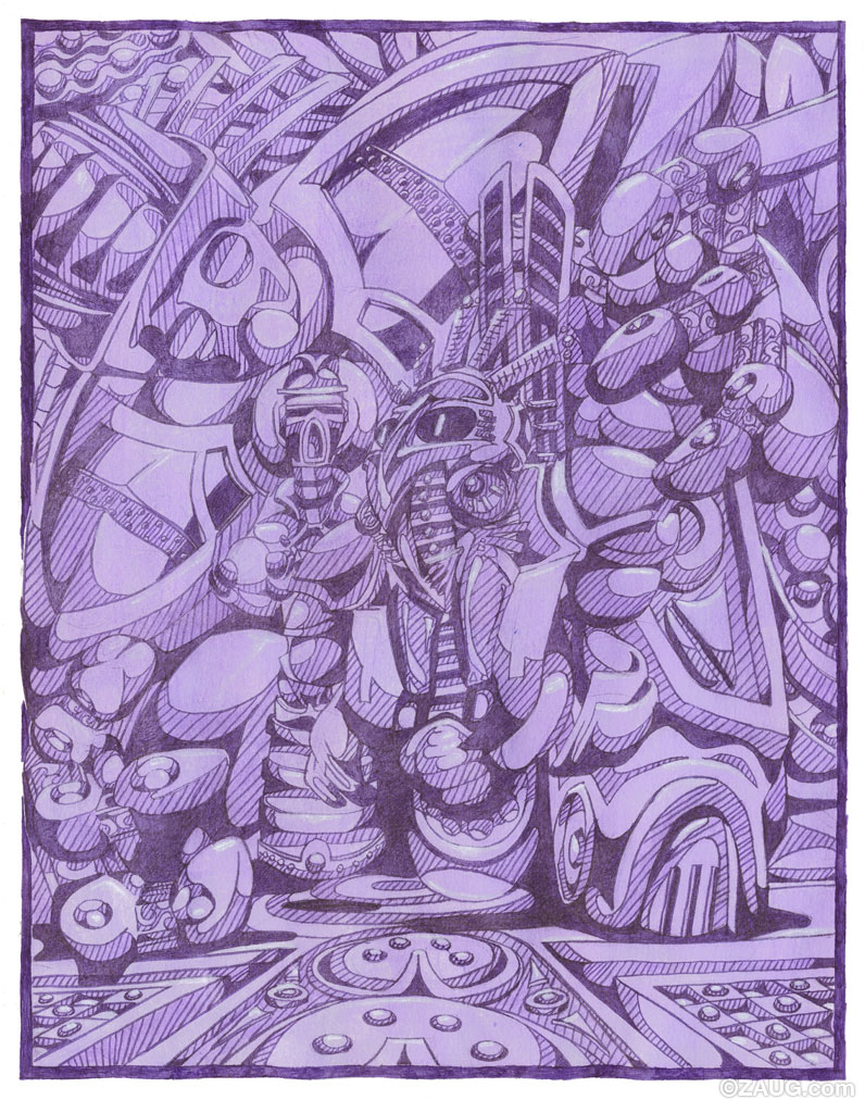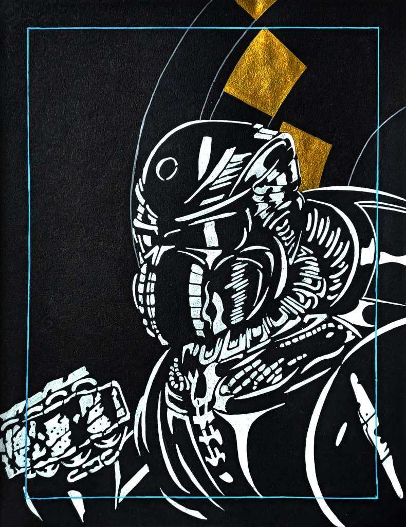 On the left, a cryptic code appears—drawn from Zaug’s own life during his covert years overseeing the ZAUG security force under the Wattii corporation. According to the artist, the code within this painting holds the key to a real invention—one with the potential to transform the future.