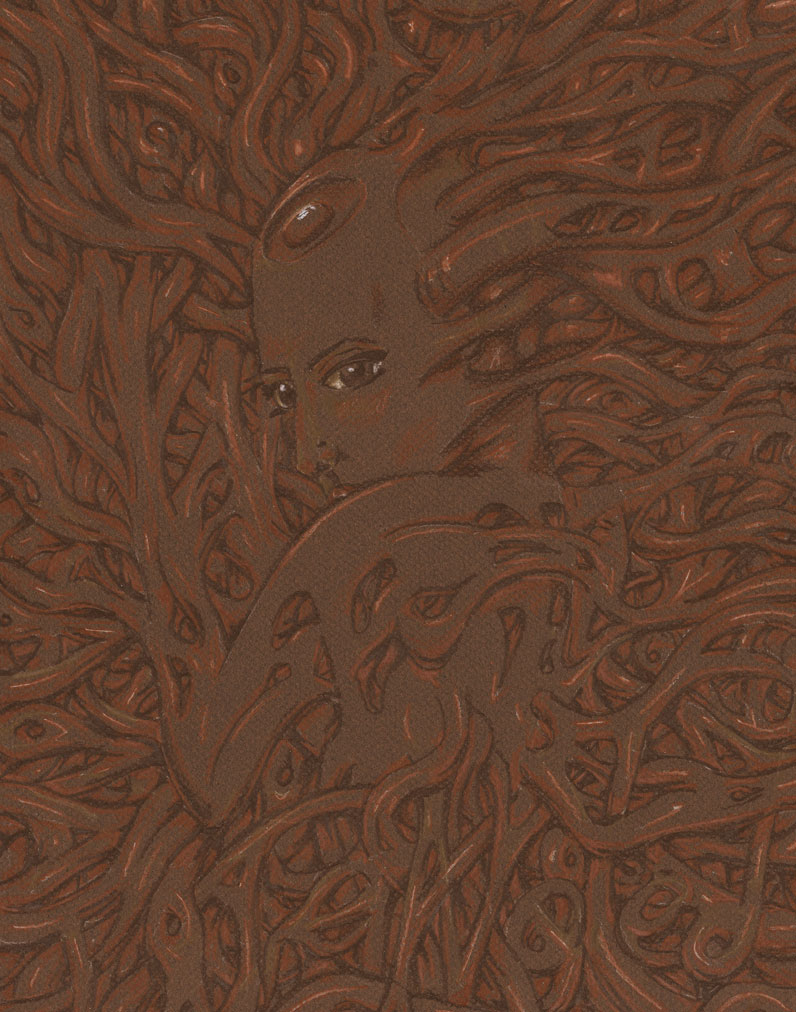 Potu’s art blends the strength of his father Revo and the wisdom of his grandfather Modziw. His style features bold weighted linework and detailed ink drawings that capture the spirit of Wiiowii Island. Always on the move and full of youthful energy, Potu creates wherever he goes, his paper often marked with the stains of adventure, making each piece a story of its own.